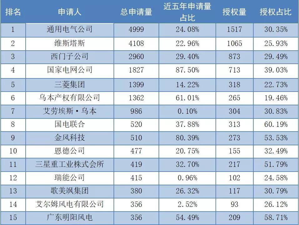 由表1可以看出,通用电气公司全球申请量居首位,达4999项,维斯塔斯、西门子公司紧随其后,上述三大企业的申请量均在2500项以上,排名第四的国家电网公司为1827项,排名第五及以后的申请人申请量均低于1500项。可见,排名前三的申请人以绝对的优势领先于其他申请人,占据风能领域的领先位置。 另外,前五位申请人的专利申请占到申请总量的16.25%,前十位申请人的专利申请共占申请总量的20.35%,表明风能产业专利授权的申请人来源相对分散,趋于多元化,之前的申请人团体掌握的绝对技术优势正在逐渐消失。在排名前十的申请人中,德国申请人所占比例最高,共有4个申请人,说明德国申请人在风能技术领域申请活跃,他们非常重视专利布局。在排名前十的申请人中,中国有3家企业,分别排名第4、第8和第9,而在排名前15的申请人中,中国有4家企业,所占比例最高,说明中国申请人也在风能技术领域申请活跃,但是与世界领先的企业相比,仍存在一定差距。 通用电气公司、维斯塔斯和西门子公司在2013~2017年的专利申请量都占其总申请量的20%以上,说明这些大公司近年来在专利方面的申请依然活跃。这也证明了这些公司目前仍然注重技术的研发并且具有较强的生命力;艾劳埃斯·乌本、瑞能公司和艾尔姆玻璃纤维制品有限公司在2013~2017年的专利申请量都不到其总申请量的5%,可见这三位申请人在风能领域的研发力量逐渐减少;国家电网公司、乌本产权有限公司、金风科技股份有限公司、国电联合动力技术有限公司和广东明阳风电产业集团有限公司在2013~2017年的专利申请量都占其总申请量的50%以上,说明这些申请人都是风能领域的后起之秀,保持着良好的发展势头。 在授权量方面,国电联合动力技术有限公司、广东明阳风电产业集团有限公司、北京金风科创风电设备有限公司和三星重工业株式会所是排名前4的企业,前述四者的发明或实用新型授权占比都达到50%以上,国电联合动力技术有限公司更是达到了60%以上,对上述4个企业的授权量的发明授权量对比,国电联合动力技术有限公司、广东明阳风电产业集团有限公司和北京金风科创风电设备有限公司的发明授权量分别占总申请量的21.31%、12.37%和10.57%,说明中国申请人的专利申请中实用新型的授权占比重相当大,对比授权量同样占前列的三星重工业株式会所50.83%的发明授权占比,说明虽然中国目前在风能技术方面是发展势头良好,但仍然需要增加在风能技术方面的重大突破,从而追赶欧美日的技术,并且需要注重对高技术含量的专利的申请,注重其在多个国家和地区的同时保护。