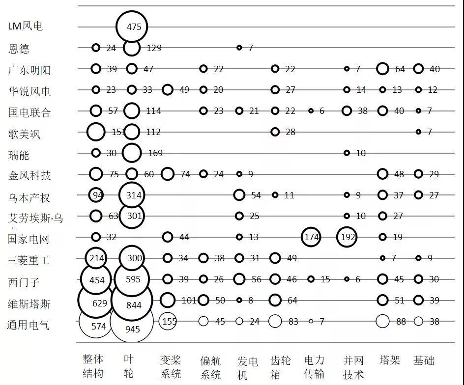 图 2 主要申请人与技术分支(单位:项) 从图2中可以看出,通用电气、维斯塔斯、三菱重工、歌美飒和西门子的专利技术主要集中在风力发电机的整机结构和叶轮两个技术分支中,国家电网的专利技术则主要集中在电力传输和并网技术两个技术分支中,艾劳埃斯·乌本、乌本产权、瑞能、恩德和LM风电的专利技术则主要集中在叶轮这一个技术分支中。