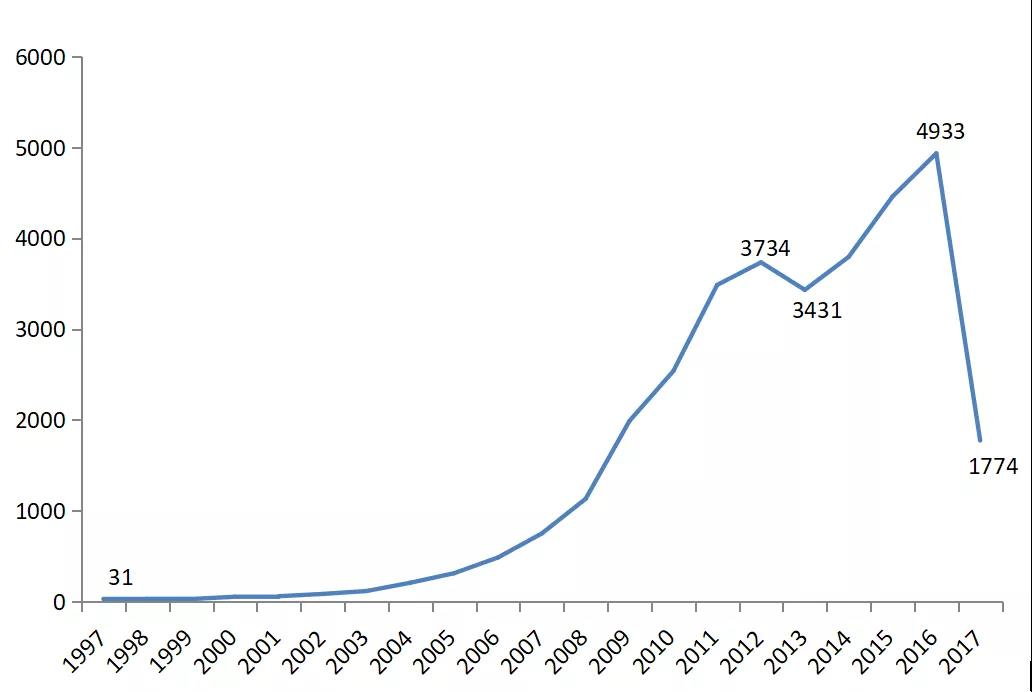 图3 中国专利申请发展趋势图 相比于世界上风能领域比较早萌芽的德国,我国稍后一年,从图3可以看出,我国自1999年开始在风能领域的专利申请,自1999年至2017年6月,我国在风能领域专利申请发展整体呈上升的趋势。具体来说,中国风力发电始于20世纪80年代,发展相对滞后,但起点较高,主要经历了3个重要的发展阶段:第1阶段:1985~1995年试验阶段,此阶段主要是利用丹麦、德国、西班牙政府贷款,进行一些小项目的示范,同时欧洲风电大国利用本国贷款和赠款的条件,将它们的风机在中国市场进行试验运行,积累了大量的经验;第2阶段:1995~2003年在第1阶段取得的成果基础上,中国各级政府相继出台了各种优惠的鼓励政策,科技部通过科技攻关和国家863高科技项目促进了风电技术的发展,原经贸委、计委分别通过双加工程、国债项目、乘风计划等项目促进风电的持续发展,表现在专利申请方面,从1997年到2003年虽然一直都有增长,但是增长速度缓慢,整体专利申请量偏少,在此阶段中国的国家风电规划中设立的国产风机攻关项目,也取得了初步成果;第3阶段:2003年至今中国国家发展和改革委员会通过风电特许权经营,下放50兆瓦以下风电项目审批权,要求国内风电项目、风电机组设备国产化比例不小于70%等政策,扶持和鼓励国内风电制造业的发展,使国内风电市场的发展进入到一个高速发展的阶段,表现在专利申请方面,从2004年开始至2012年,呈现出较之前更高的速度增长,经过2013年和2014年的调整,之后又呈较高的增长趋势,并于2016年达到了4933项的峰值。 (四)中国主要专利技术聚集区