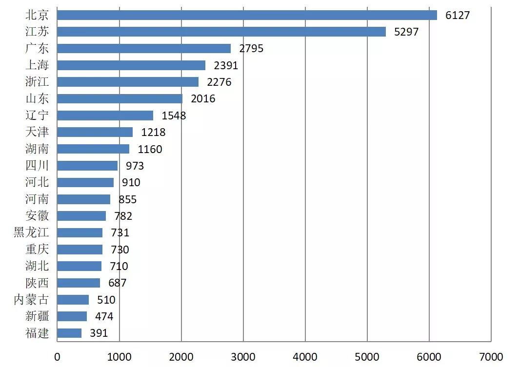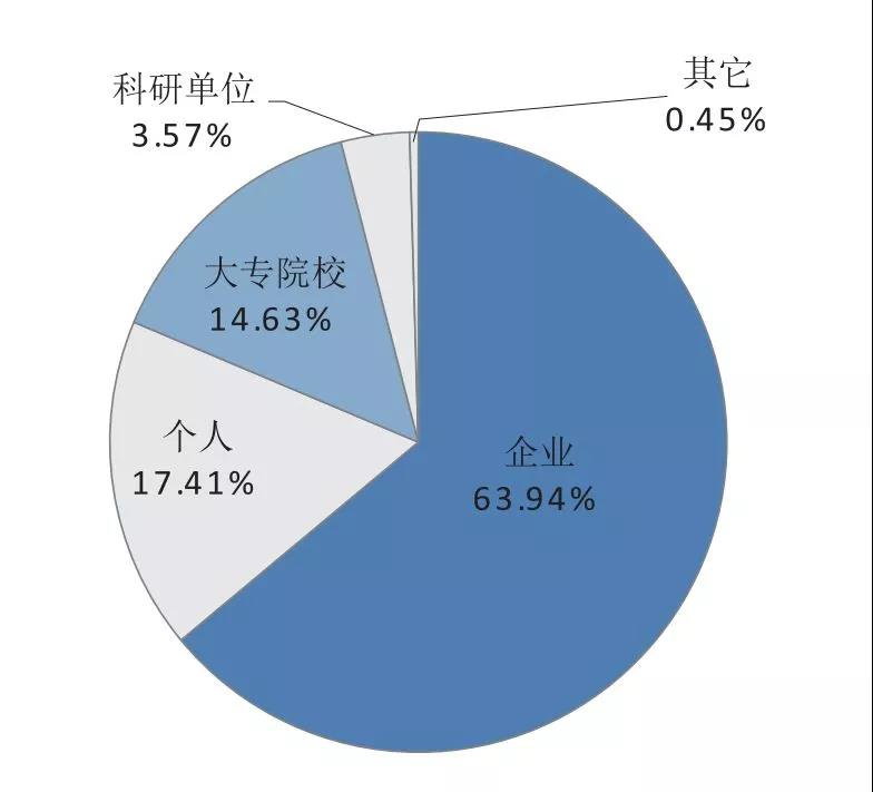 图4 国内主要地区专利申请排名 从图4可以看出,国内专利申请主要集中于华北地区的北京、华东地区的江苏、上海、浙江和山东以及华南地区的广东,西北、西南以及港澳台地区申请量不算突出,其中北京以申请量6127项居于首位,江苏以申请量5297项位列第二,广东、上海、浙江分别以申请量2795项、2391项和2276项位列第三到第五,上述五个省市占整个国内申请量的46.72%,显示出这五个省市在风能领域突出的技术实力,尤其是北京和江苏,其申请量几乎是排名第三的广东的申请量的两倍。 (五)中国申请人类型统计